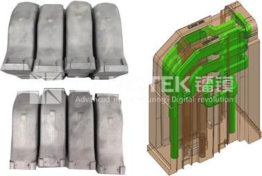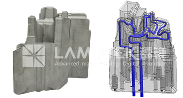 Benefits: By incorporating 3D printed inserts, the local hot spot temperature decreased from 453 degrees Celsius to 214 degrees Celsius, resulting in a 23% increase in die casting cycle time.